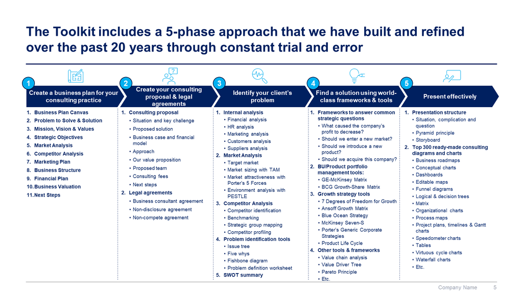 The Toolkit includes frameworks, tools, templates, tutorials, real-life examples, best practices, video training, and the following 5-phase approach: (I) Create a business plan for your consulting practice, (II) Create your consulting proposal and legal agreements, (III) Identify your client’s problem, (IV) Find a solution using world-class frameworks & Tools, (V) Present effectively.