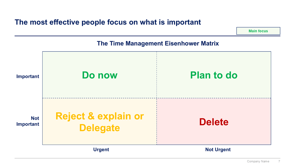 Example: Responding to non-critical emails, attending unnecessary meetings, or resolving issues that someone else can handle.