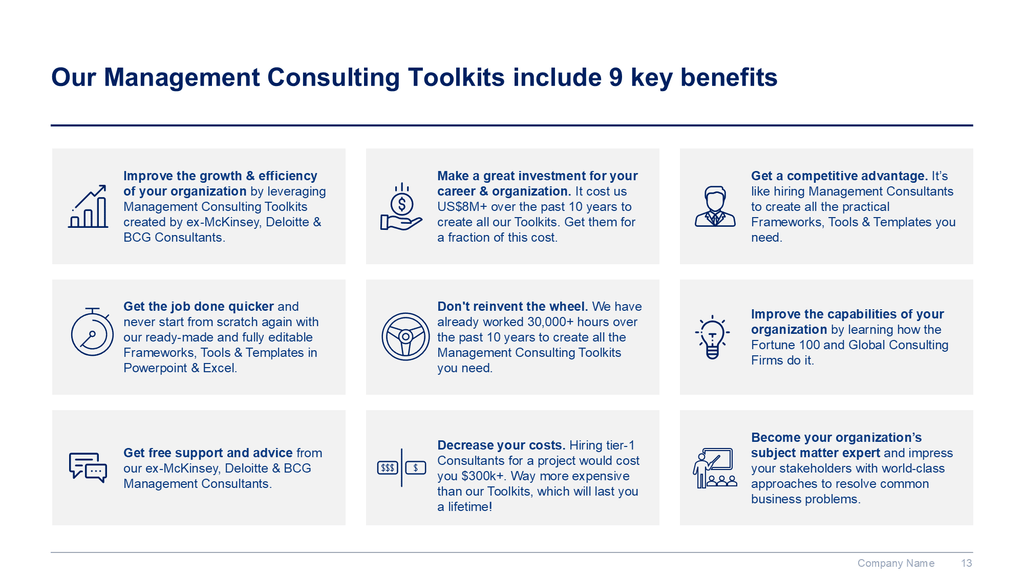 Improve the growth & efficiency of your organization by leveraging Management Consulting Toolkits created by ex-McKinsey, Deloitte & BCG Consultants.