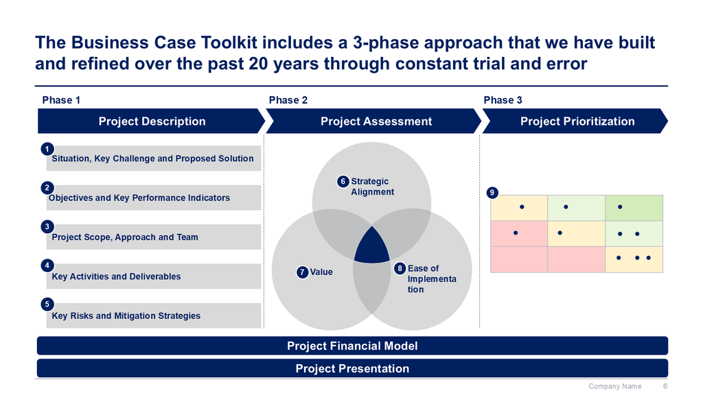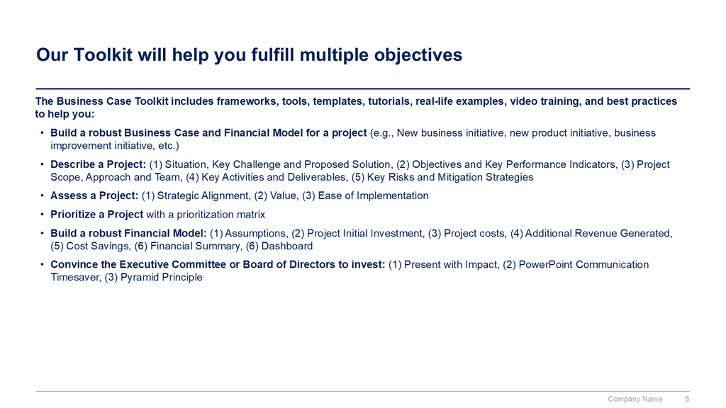 This Toolkit was created by ex-McKinsey, Deloitte and BCG Management Consultants, after more than 3000 hours of work. It is considered the world's best & most comprehensive Business Case Toolkit. It includes all the Frameworks, Best Practices & Templates required to assess the strategic alignment, value and feasibility of a project (e.g., New business initiative, new product initiative, business improvement initiative, etc.) and convince the executive committee or board of directors to invest.