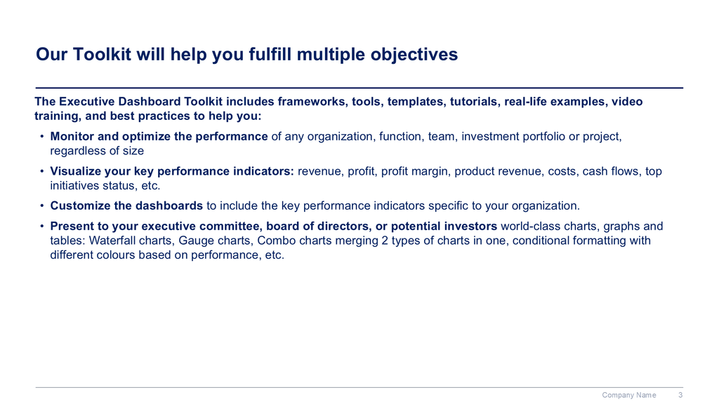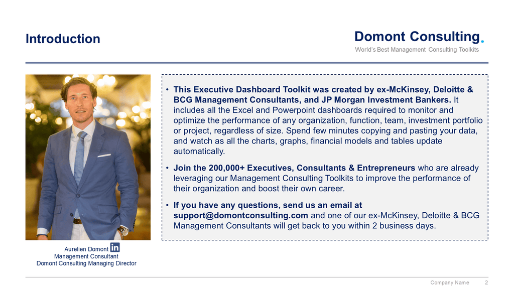 This Executive Dashboard Toolkit was created by ex-McKinsey, Deloitte & BCG Management Consultants, and JP Morgan Investment Bankers. It includes all the Excel and Powerpoint dashboards required to monitor and optimize the performance of any organization, function, team, investment portfolio or project, regardless of size. Spend few minutes copying and pasting your data, and watch as all the charts, graphs, financial models and tables update automatically.
