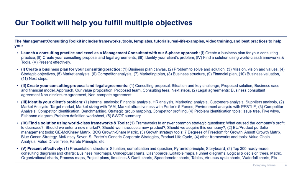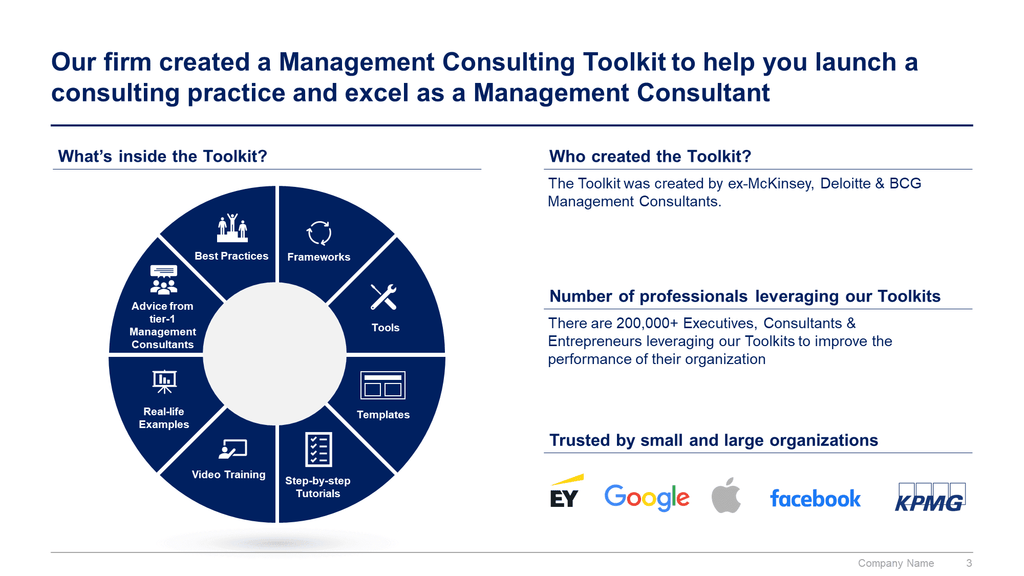 This Toolkit was created by ex-McKinsey, Deloitte & BCG Consultants, after 4,000+ hours of work. It is considered the world's best & most comprehensive Management Consulting Toolkit. It includes all the Frameworks, Best Practices & Templates required to launch a management consulting practice and excel as a Management Consultant.
