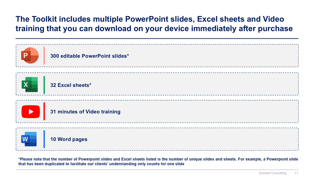 With all these toolkits, Domont Consulting provided an invaluable resource for me and my Consulting Firm. It would have taken us more than a year to create the same Toolkits on our own!