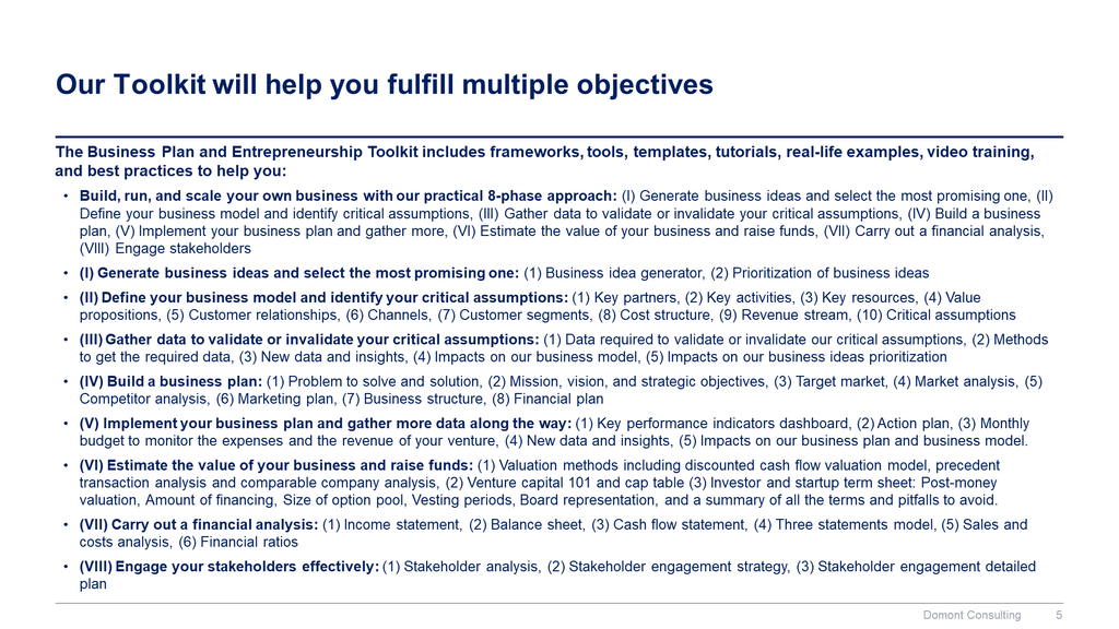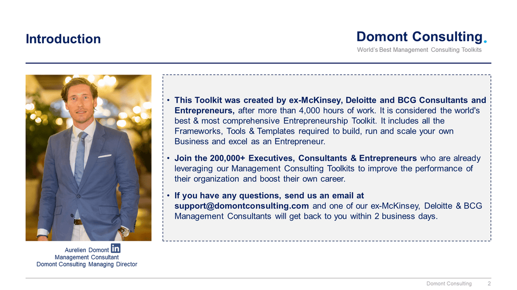 Really a timesaver for consultants. It is very resourceful and enlightening. I was amazed at the quality and concise content. Plus if you know the value of such, you would know that you have received more bang for your buck than you would find elsewhere. Overall I am delighted and I know this will improve our consulting business in more ways than one. Thanks Aurelien and the Domont Team