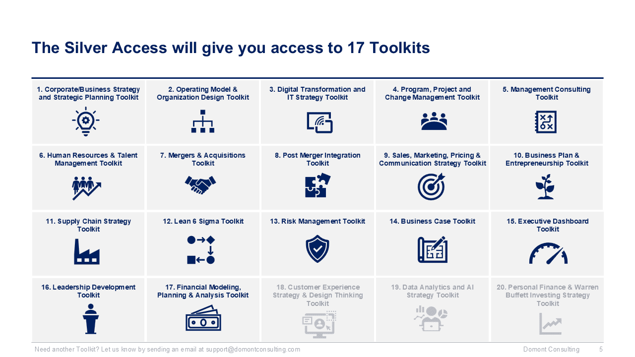 Get 17 Toolkits. Now you can learn how the Fortune 100 and Top Global Consulting Firms solve business problems and outperform their competitors. Our Toolkits include Frameworks, Best Practices and Templates created by ex-McKinsey, Deloitte & BCG Management Consultants over the past 11 years, after 50,000+ hours of work. They are considered the world's best Management Consulting Toolkits.