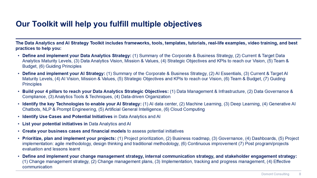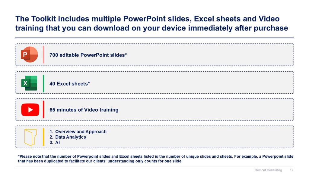 Decrease your costs. Hiring tier-1 Consultants for a project would cost you $300k+. Way more expensive than our Toolkits, which will last you a lifetime!