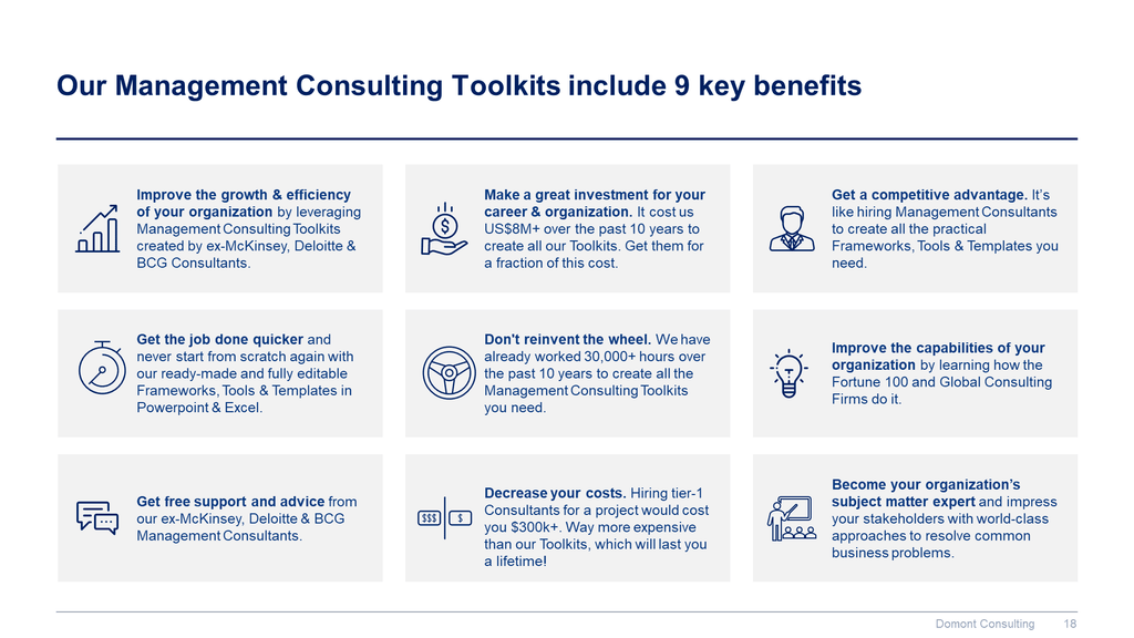 That’s why in 2012, I teamed up with other ex-McKinsey, Deloitte and BCG Consultants to create comprehensive Management Consulting Toolkits designed to solve your business problems and improve the growth and efficiency of your organization!