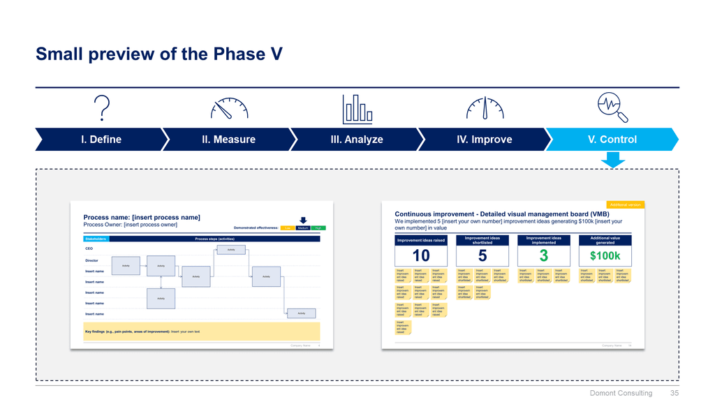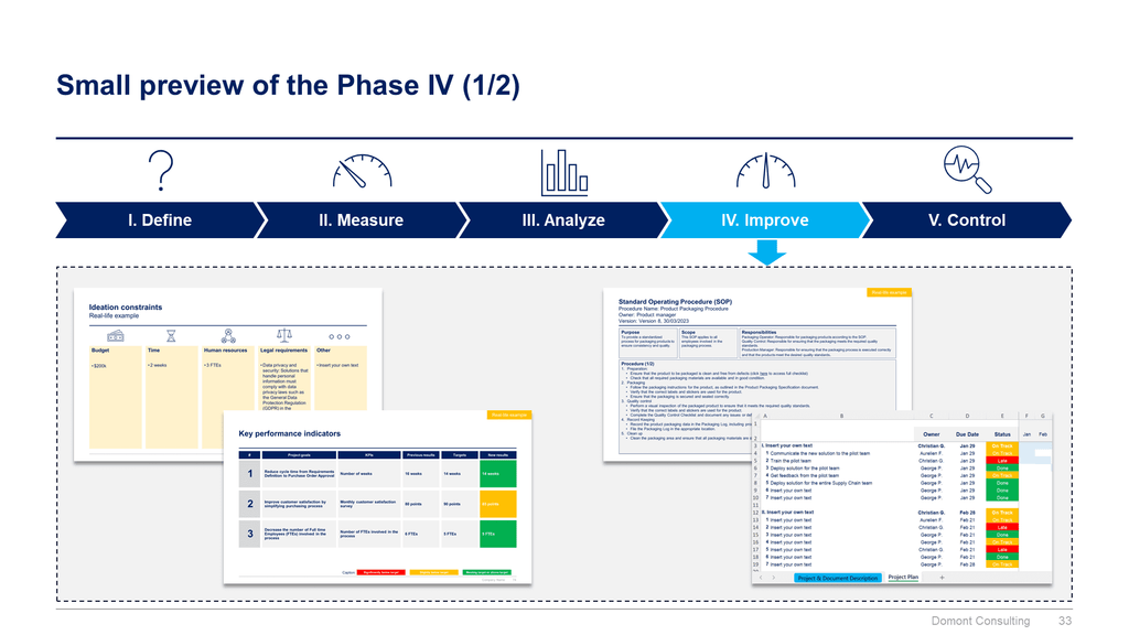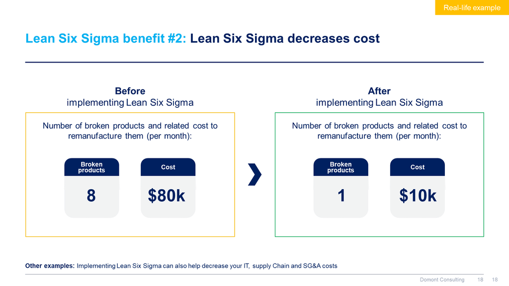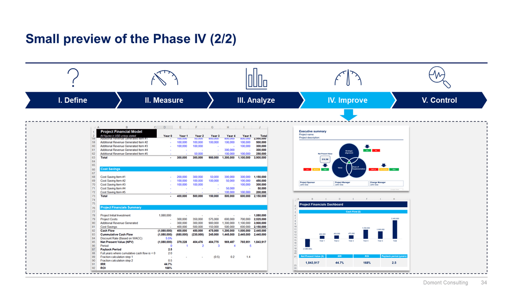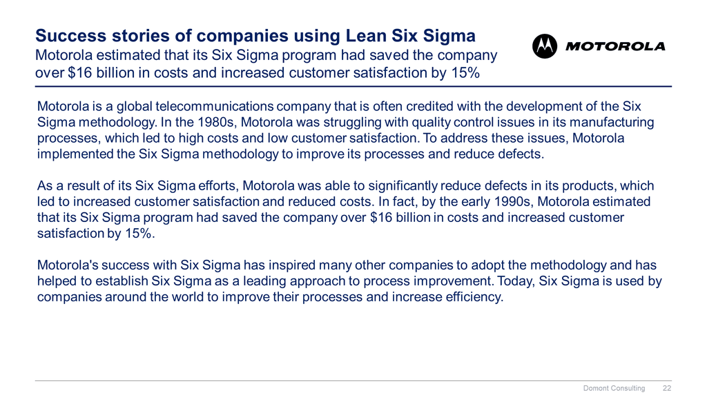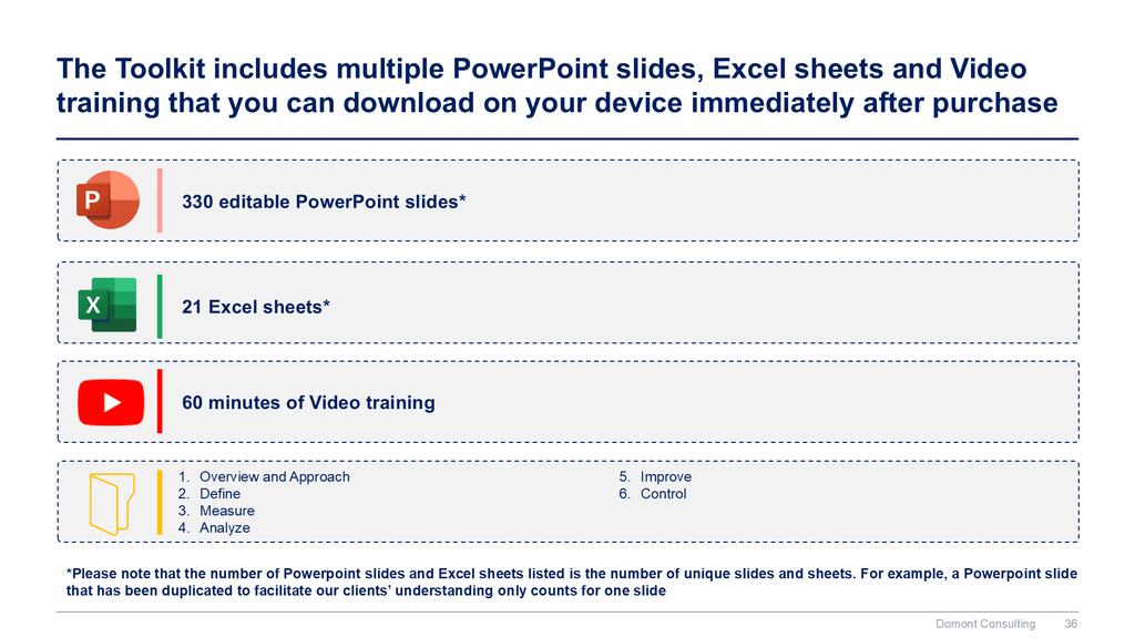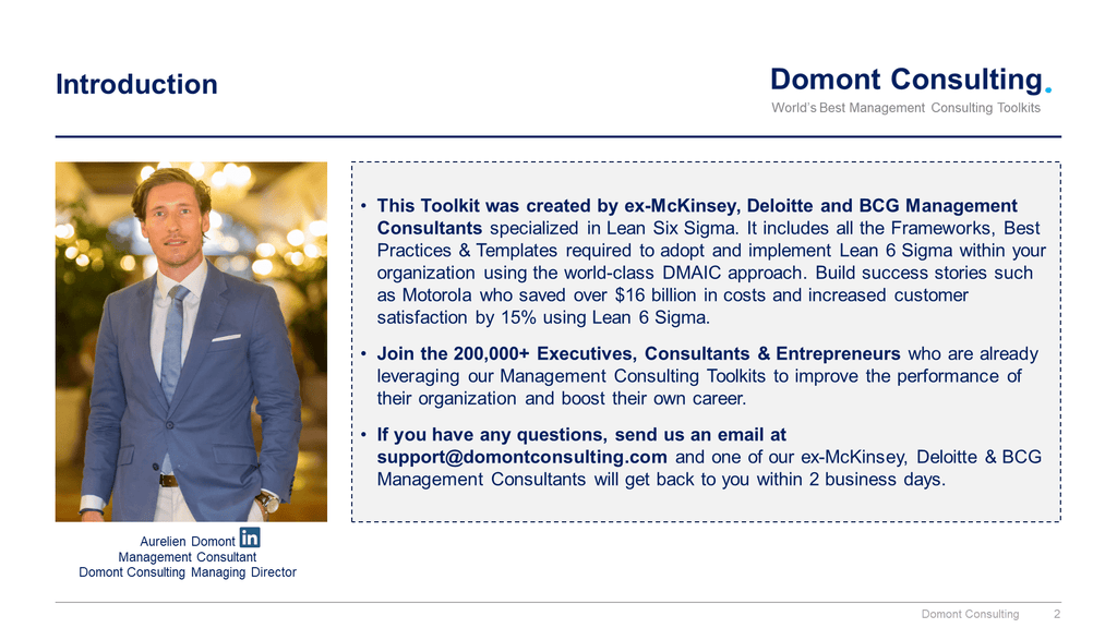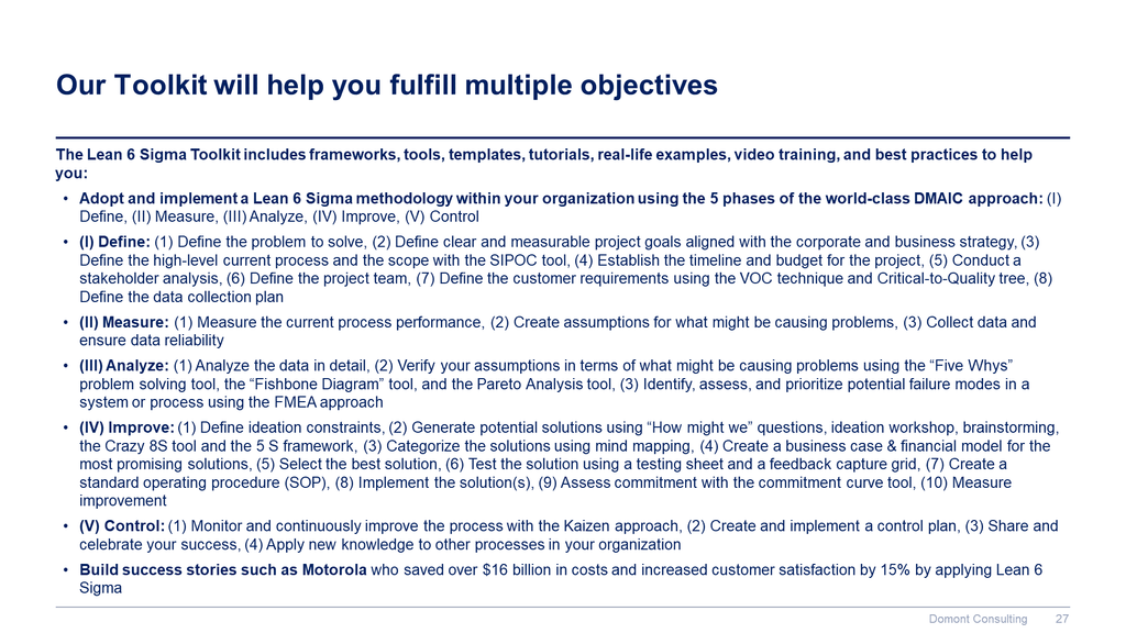 This Toolkit was created by ex-McKinsey, Deloitte and BCG Management Consultants specialized in Lean Six Sigma. It includes all the Frameworks, Best Practices & Templates required to adopt and implement Lean 6 Sigma within your organization using the world-class DMAIC approach. Build success stories such as Motorola who saved over $16 billion in costs and increased customer satisfaction by 15% using Lean 6 Sigma.