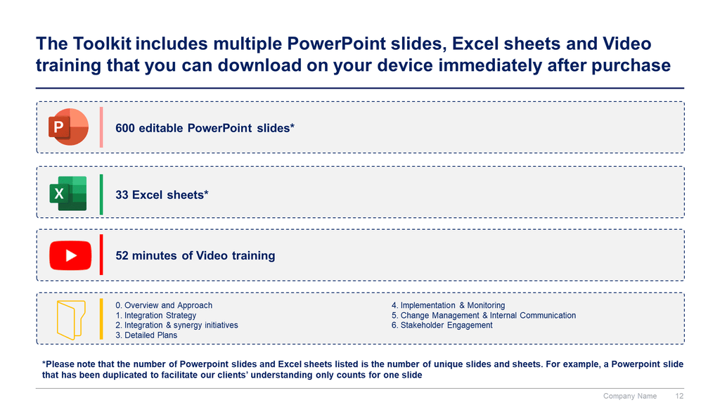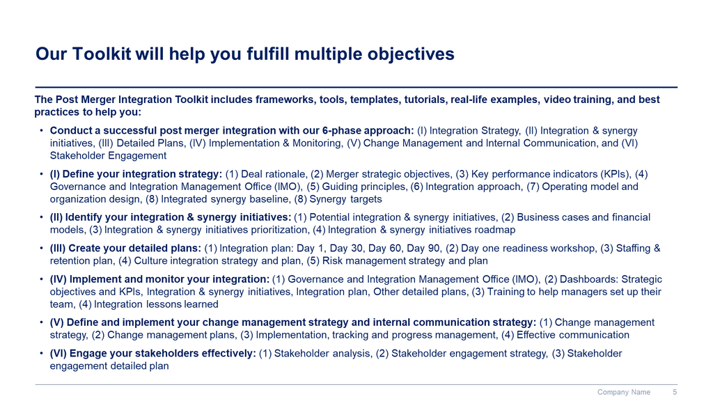 This Toolkit was created by ex-McKinsey, Deloitte and BCG Management Consultants, after more than 3000 hours of work. It is considered the world's best & most comprehensive Post Merger Integration Toolkit. It includes all the Frameworks, Best Practices & Templates required to increase the value creation of your Mergers & Acquisitions.