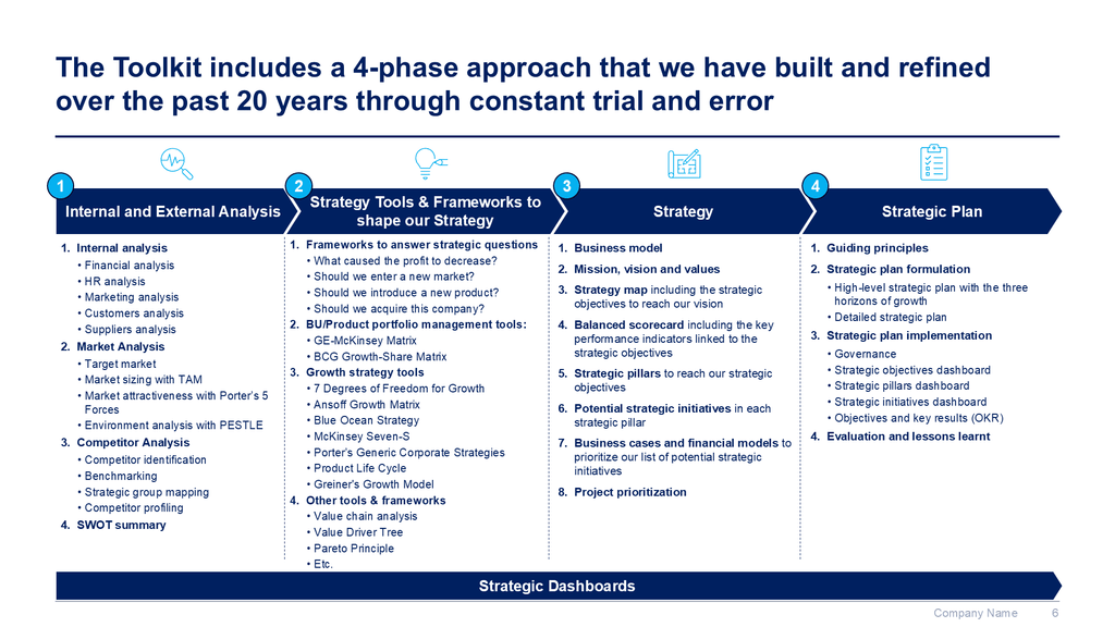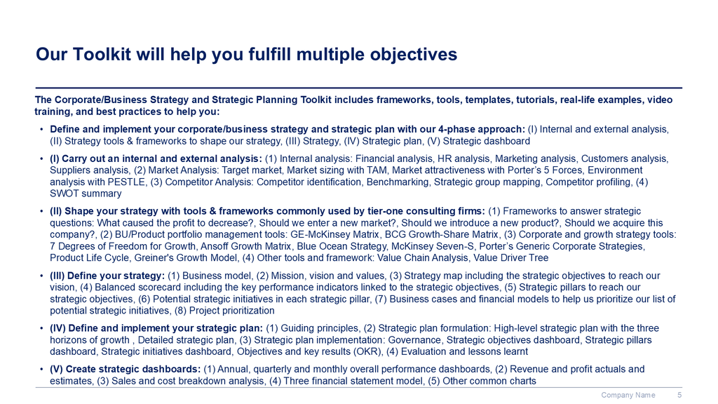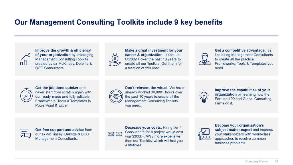 Decrease your costs. Hiring tier-1 Consultants for a project would cost you $300k+. Way more expensive than our Toolkits, which will last you a lifetime!